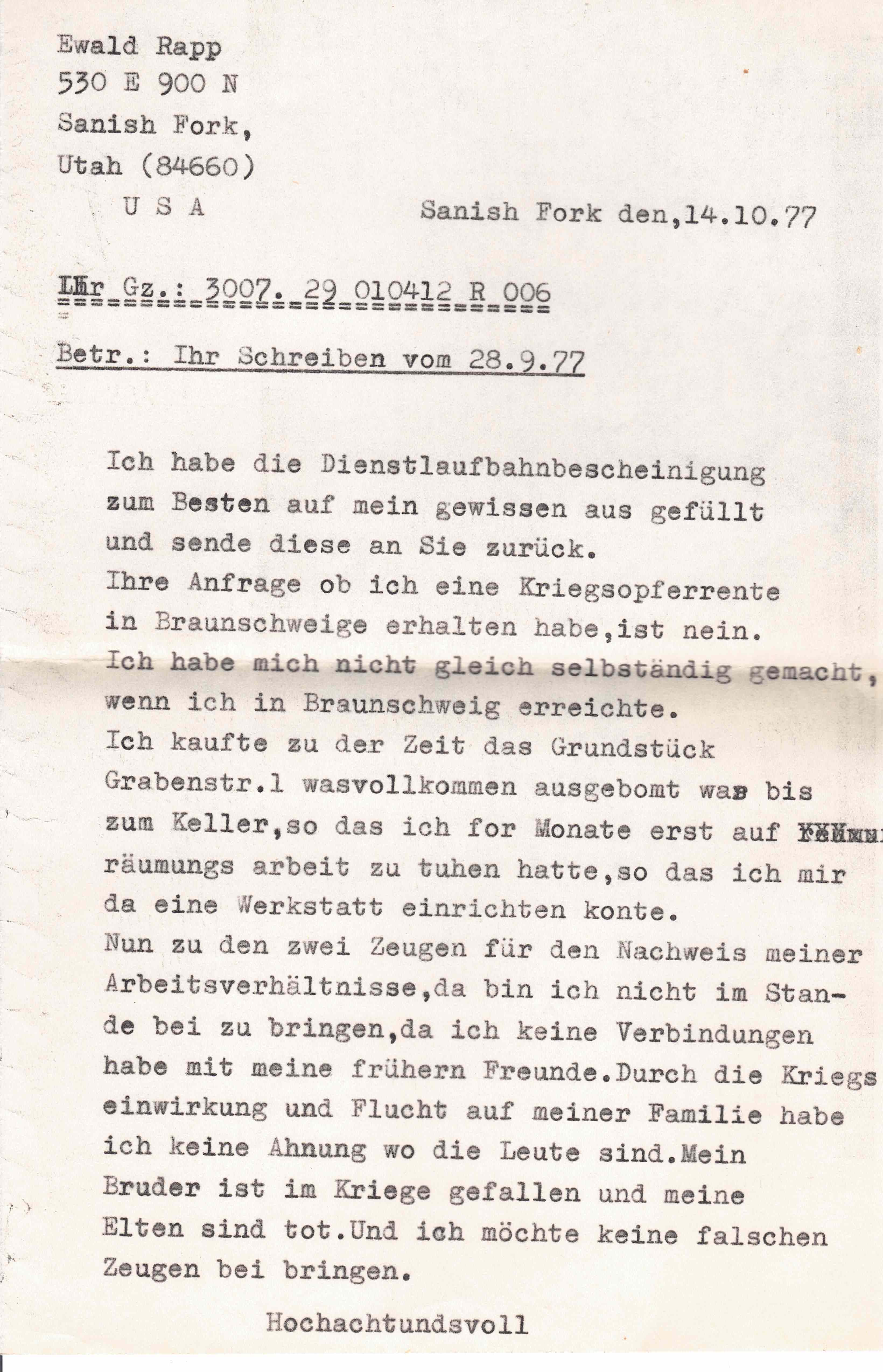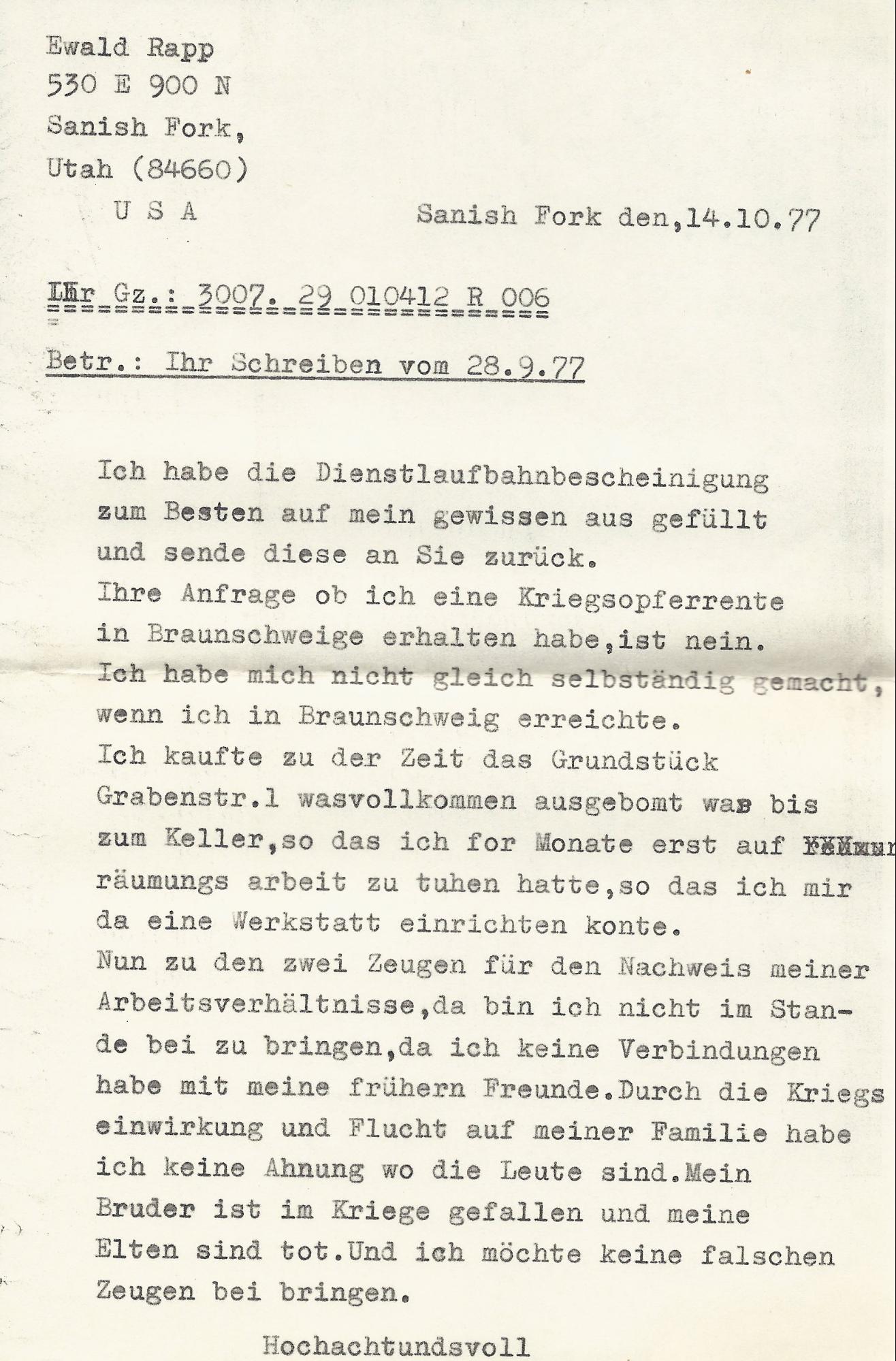 Ich habe die Dienstlaufbahnbescheinigung zum Besten auf mein gewissen aus gefüllt und sende diese an Sie zurück. Ihre Anfrage ob ich eine Kriegsopferrente in Braunschweige erhalten habe, ist nein. Ich habe mich nicht gleich selbständig gemacht, wenn ich in Braunschweig erreichte. Ich kaufte zu der Zeit das Grundstück Grabenstr. 1 was vollkommen ausgebomt was bis zum Keller, so das ich for Monate erst auf räumungs arbeit zu tuhen hatte, so das ich mir da eine Werkstatt einrichten konte.