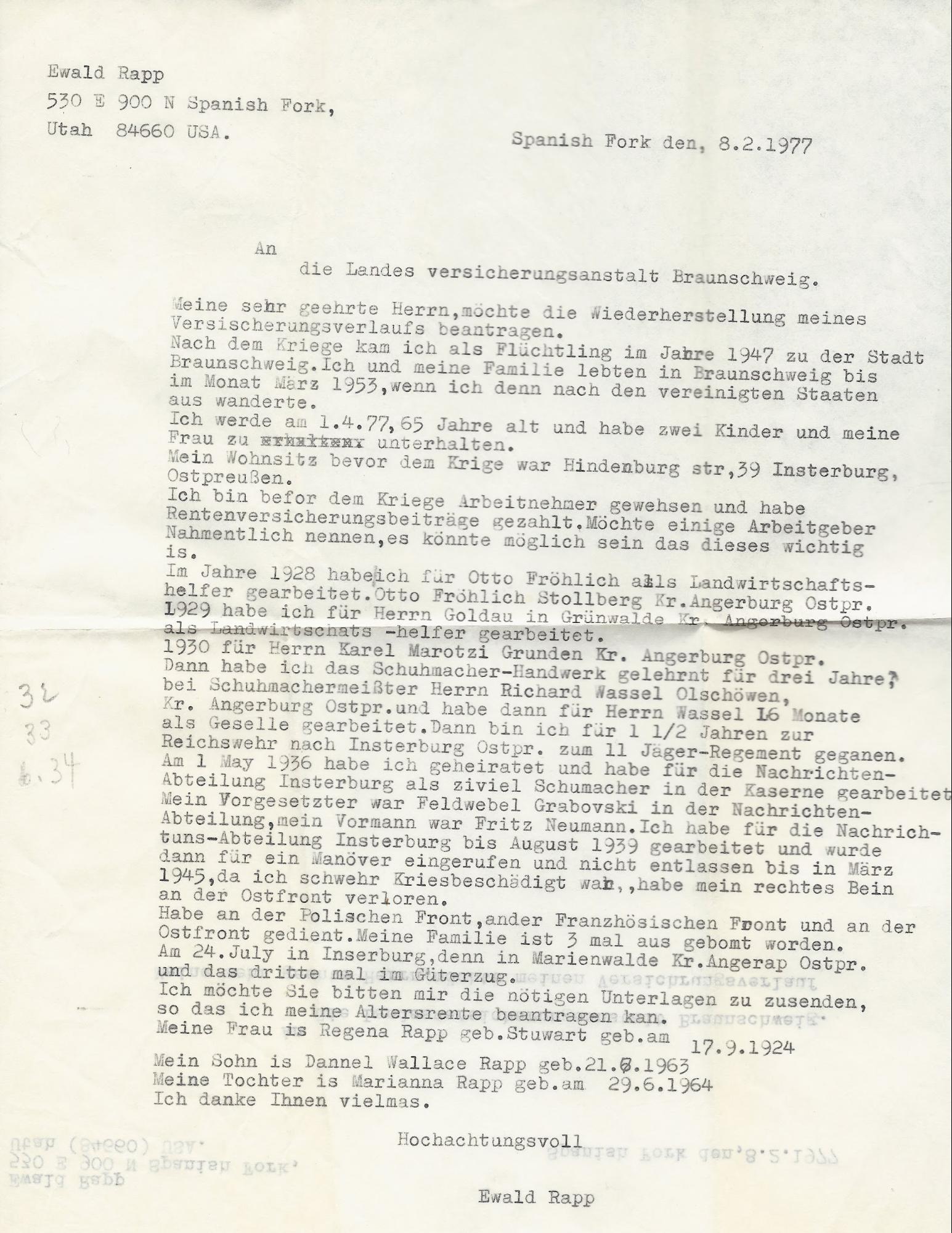 I would like to ask you to send me the necessary documents so that I can apply for my old-age pension. My wife is Regena Rapp, née Stewart, born September 17, 1924. My son is Dannel Wallace Rapp, born August 21, 1963. My daughter is Marianna Rapp, born June 29, 1964. Thank you very much. Respectfully, Ewald Rapp.